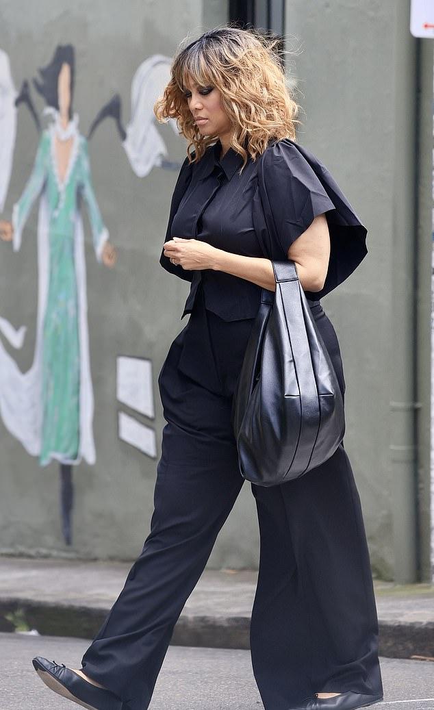 51-летняя модель, которая в понедельник расплакалась в эфире австралийского утреннего шоу, была одета в черную рубашку на пуговицах с драматично расклешенными короткими рукавами и брюки в тон.
