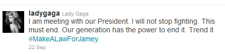 Напомним, что певица очень хотела встретиться с президентом чтобы обсудить с ним проблемы молодых людей, которых унижают в школах. Певица была в шоке от смерти одного из своих фанатов, который покончил с собой из-за насмешек одноклассников. Леди Гага в Твиттере писала о своём намерении встретиться с президентом и обсудить с ним издевательства в учебных заведениях.