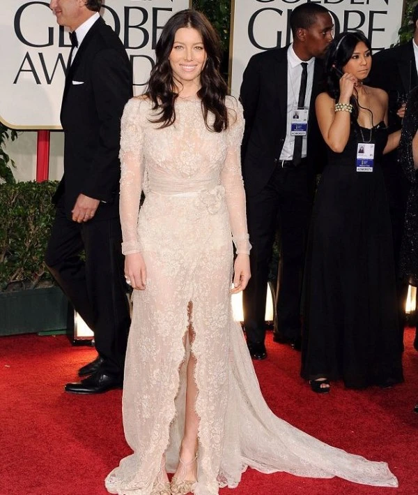 Джессику Биль ехидно вопрошают, уж не репетирует ли она свою свадьбу, надев платье, похожее на подвенечное. Ей не хватает букета невесты, хотя обилие цветочков на платье (совершенно ненужное, кстати) это компенсирует.