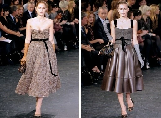 Louis Vuitton обожает моду 50-х и охотно приветствует пышные юбки в клетку или однотонные, рисуя тем самым общепринятый стандарт тогдашней фигуры “песочные часы”. Длина платьев и юбок доходит до колен, а то и ниже. Новаторский аккорд – сумки геометрической формы и туфли-лодочки.