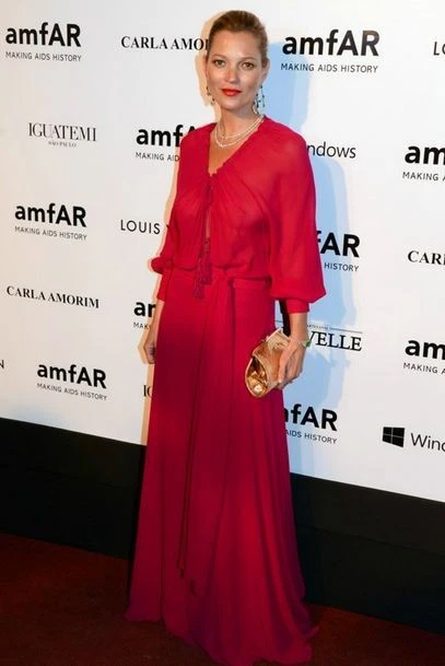 Кейт Мосс появилась в том же наряде в начале апреля 2014 года в Сан-Пауло на вечеринке amfAR. Этот вариант платья был более ярким и поэтому к нему подошли крупные серьги, ожерелье, а также британская модель добавила золотистый клатч: