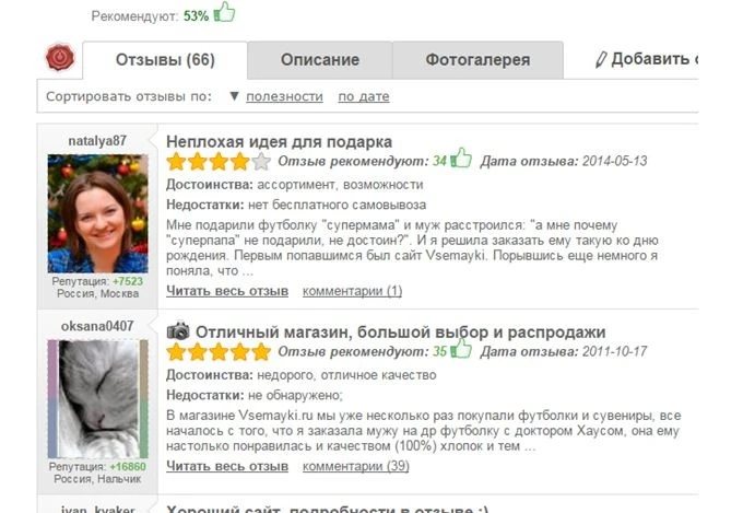 Также популярный в рунете сайт с отзывами о любых сайтах и интернет-магазинах. Как видно из оценок, мнения пользователей делятся пополам. На этом сайте написаны самые подробные отзывы покупателей о vsemayki.ru. С фотографиями, отчетами и описанием купленных товаров.Ну и наконец, самый популярный рекомендательный сервис — iRecommend.ru http://irecommend.ru/content/vsemaikiru-internet-magazin-futbolok-i-ne-tolko