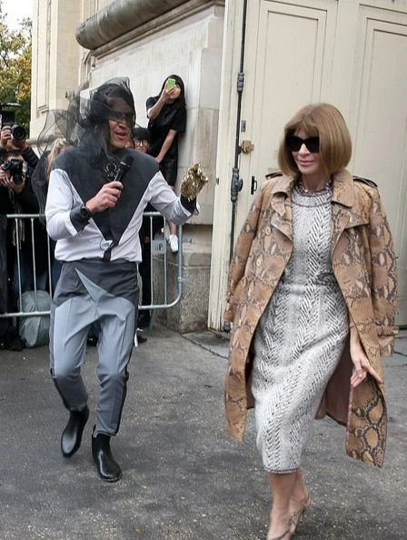 На выходе с показа Шанель в Париже к Анне Винтур подбежал Виталий Седюк в тёмной вуали и с блестящей перчаткой: