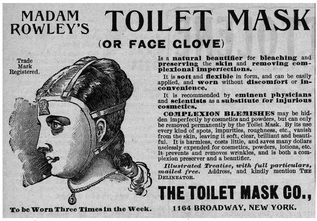 В середине 19 века в Америке обрела популярность так называемая «туалетная маска», в которой женщины спали всю ночь. Её ещё называли перчаткой для лица, поскольку маска была сделана из резины и плотно закреплялась на лице. Считалось, что лицо под ней потеет, поры стягиваются и очищаются, а морщины разглаживаются. Однако вместо обещанной красоты женщины получали различные грибковые заболевания и деформацию лица.