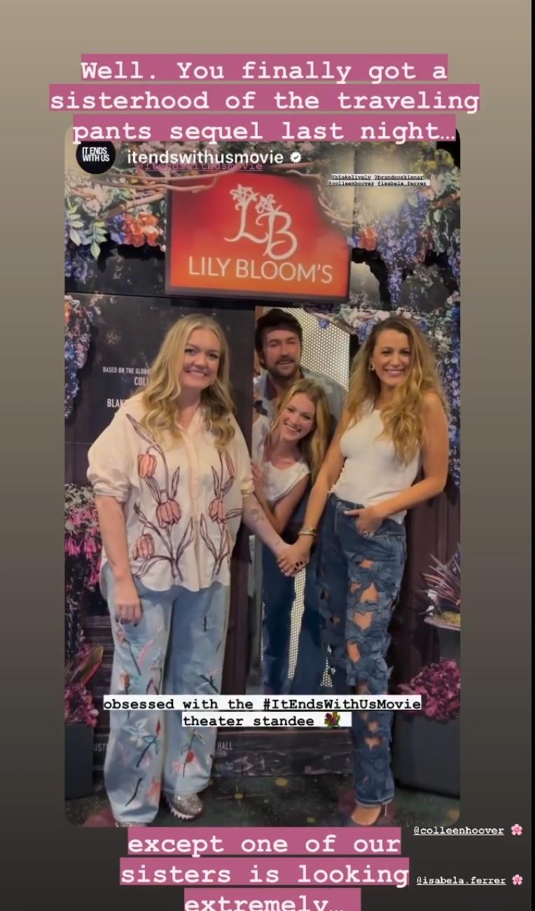 «Что ж, вчера вечером у вас наконец-то появился сиквел «Братства странствующих штанов». За исключением того, что одна из наших «сестер» выглядит очень по-мужски», — подписала она видео, на котором она позирует с Изабелой Мерсед, Брэндоном Скленаром и писательницей Колин Гувер, автором романа «Все заканчивается на нас».