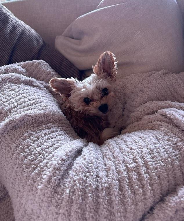 На другом снимке их собака Пигги Лу жует кость на диване кремового цвета, а их другая собака Оскар по-прежнему укутана в одеяло неподалеку.