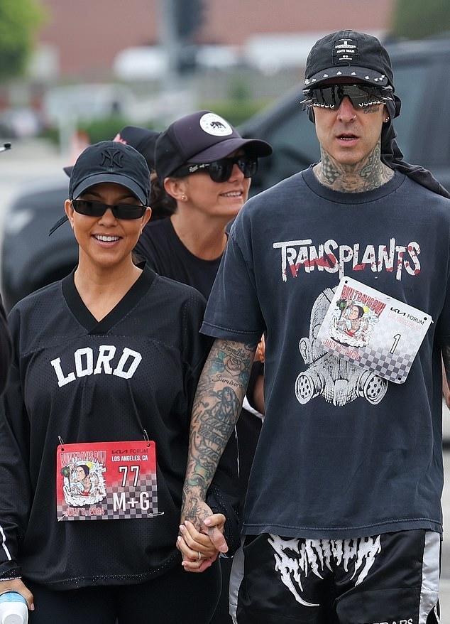 48-летний Баркер также предпочел черный цвет: футболку с коротким рукавом с принтом Transplants, шорты и носки Famous Stars and Straps, черные кроссовки.