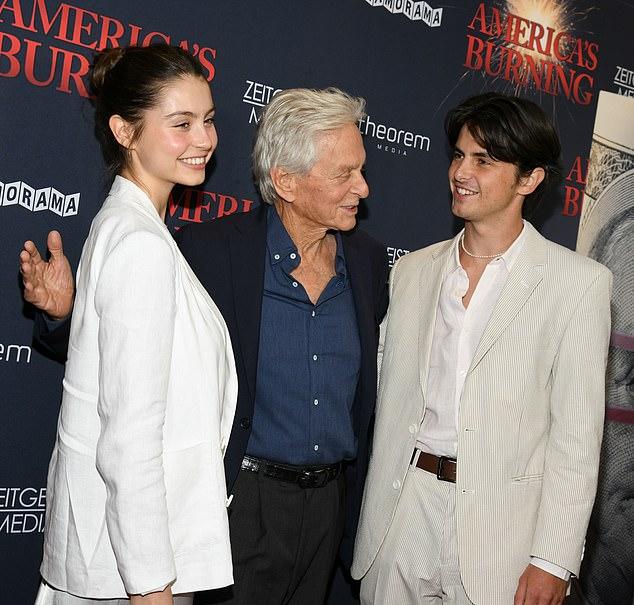 Майкл Дуглас появился на премьере фильма America’s Burning в Нью-Йорке в среду с сыном Диланом и дочерью Кэрис.