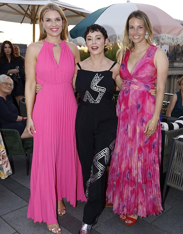 Американская актриса и активистка Роуз Макгоуэн, которой недавно исполнилось 50 лет, пересекла Атлантику, чтобы посетить празднование юбилея немецкой феминистской инициативы Frauen100. Ныне проживающая в Мексике, Роуз появилась на мероприятии в эффектном черном комбинезоне с белым змеиным принтом, обвивающим ее ноги и словно готовящимся к броску на ее плечо. Образ актрисы дополняли серебряные сапоги и колье с небесно-голубым камнем. На мероприятии Роуз позировала фотографам вместе с совладелицами PR-агентства Яниной Хелл и Фелицитас Каррер.