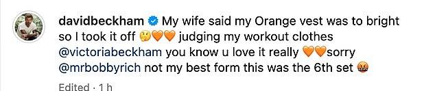 Подпись к посту гласила: «Моя жена сказала, что моя оранжевая майка слишком яркая, поэтому я её снял. Оцениваю мой выбор одежды для тренировок, @victoriabeckham , ты же знаешь, тебе это нравится. Извини, @mrbobbyrich, это не моя лучшая форма, это был уже шестой сет».