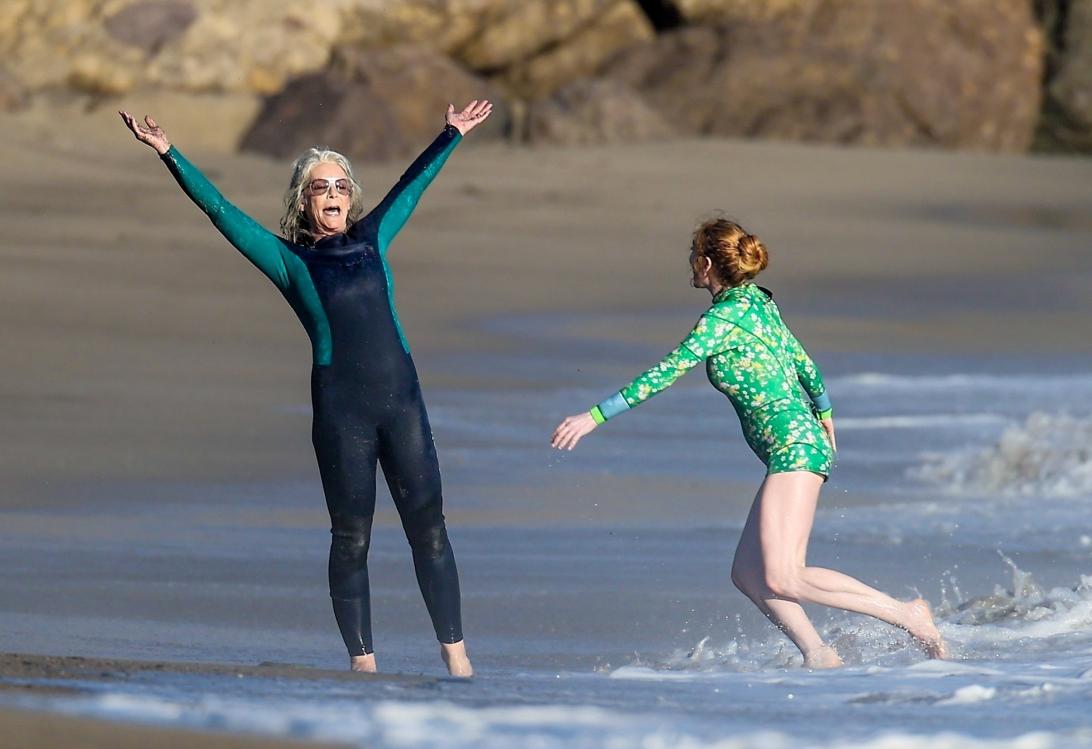 Лохан, которой сейчас 38 лет, была одета в короткий зеленый гидрокостюм с бело-желтым цветочным узором. Ее мокрые рыжие волосы были собраны в пучок. 65-летняя Кертис выбрала для съемок черный гидрокостюм в пол и солнцезащитные очки-авиаторы. Ради роли оскароносная актриса, обычно носящая короткую серую стрижку, отрастила волосы до плеч и спрятала их под париком.