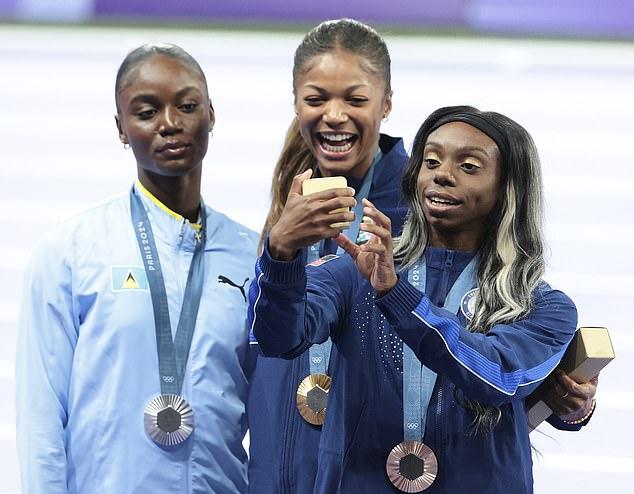 На видео Гэбби Томас (в центре) — золотая медалистка от сборной США, Джульен Альфред (слева) — серебряный призер из Сент-Люсии и Бриттани Браун (справа) — бронзовый призер из США.