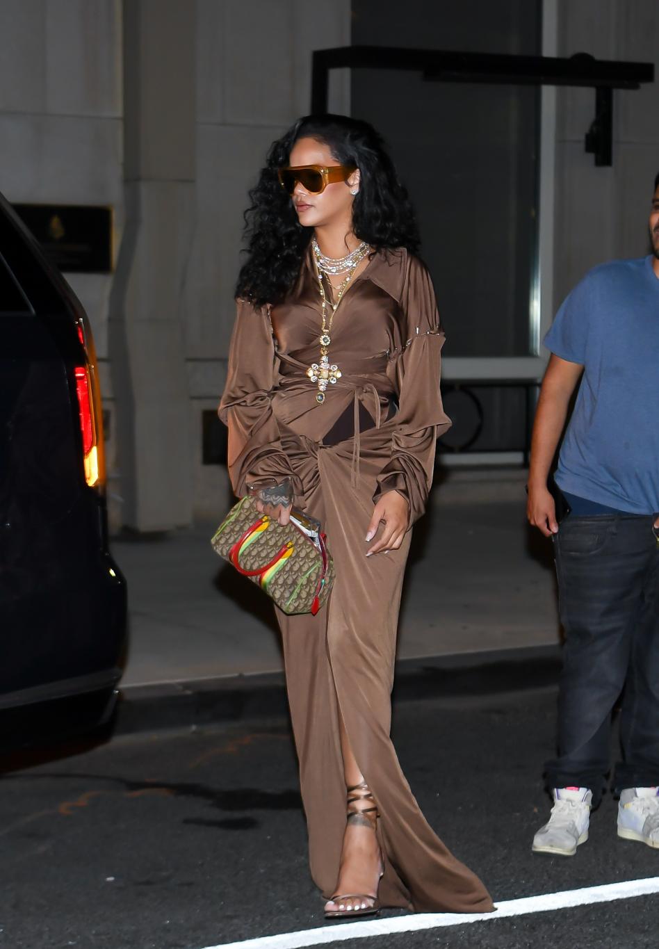 Для вечеринки в Socialista Рианна выбрала третий наряд: коричневый шелковый топ и длинную юбку в тон от Jawara Alleyne.