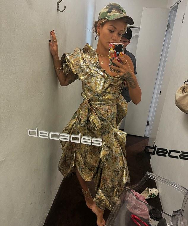 На снимках Рита демонстрирует свою фигуру в обтягивающем черном топе-бандо и светло-зеленых леггинсах, делая селфи в зеркале.