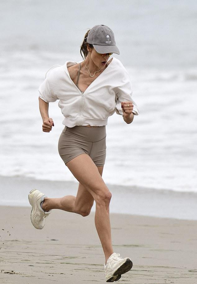 Алессандра доказала, что она все еще в отличной форме, пробежав в бежевых кроссовках New Balance