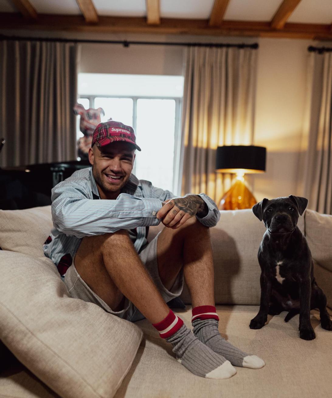 Лиам Пейн позирует на диване со своей собакой.