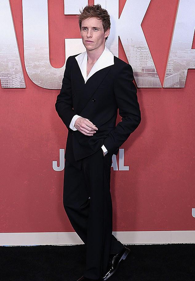 Эдди, которого фанаты нарекли «новым Джеймсом Бондом», также был замечен на ковровой дорожке в черных брюках и однобортном пиджаке в тон, а под ними была белая рубашка с широким воротником