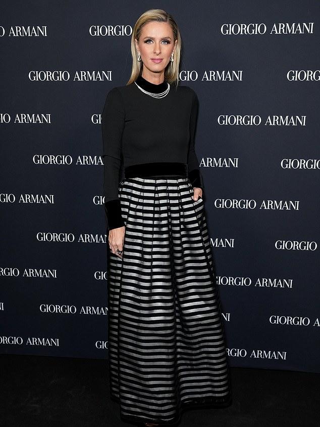 41-летняя Хилтон выбрала для мероприятия черный топ с длинными рукавами, отделанный черным бархатом на манжетах, талии и воротнике-стойке. Он был дополнен черно-серебристой юбкой макси с плиссировкой и горизонтальными полосами.
