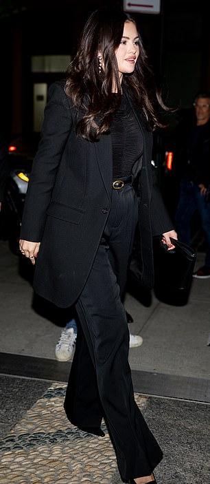 Гомес блистала в облегающей чёрной блузке с рюшами, заправленной в мешковатые чёрные брюки на чёрном ремне