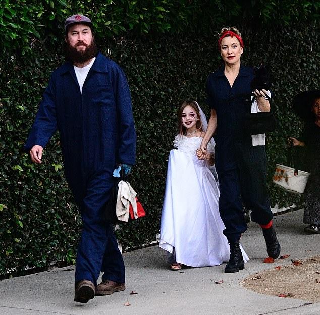 Жених Хадсон, 38-летний Дэнни Фудзикава, присоединился к маме и дочери в их походе за сладостями. Он был одет в джинсовый комбинезон, белую футболку и коричневые ботинки. Музыкант надел кепку на свои длинные темные волосы и темную перчатку на левую руку.
