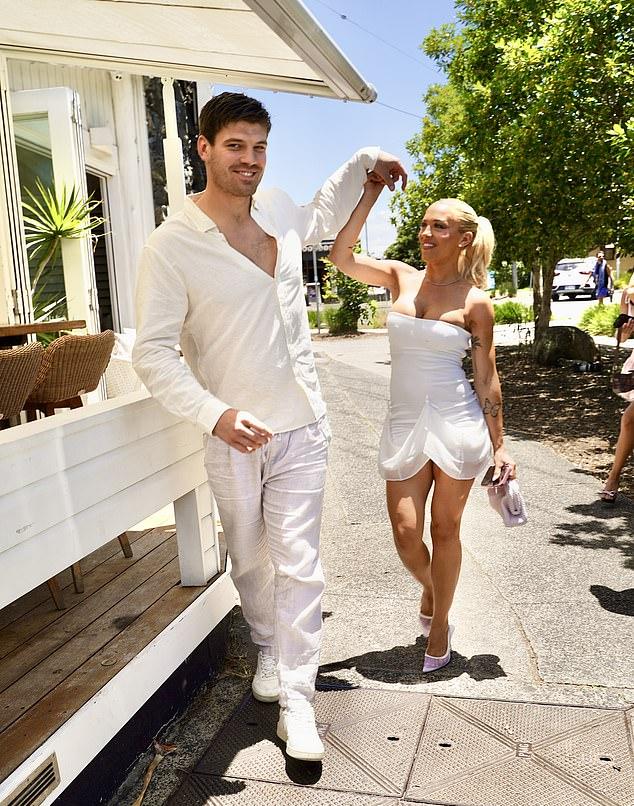 Звезда социальных сетей выбрала естественный макияж с помадой нюдового оттенка и собрала светлые волосы в хвост. Она держала в руках небольшой кремовый клатч и телефон, лучезарно улыбаясь, когда пара входила в здание.