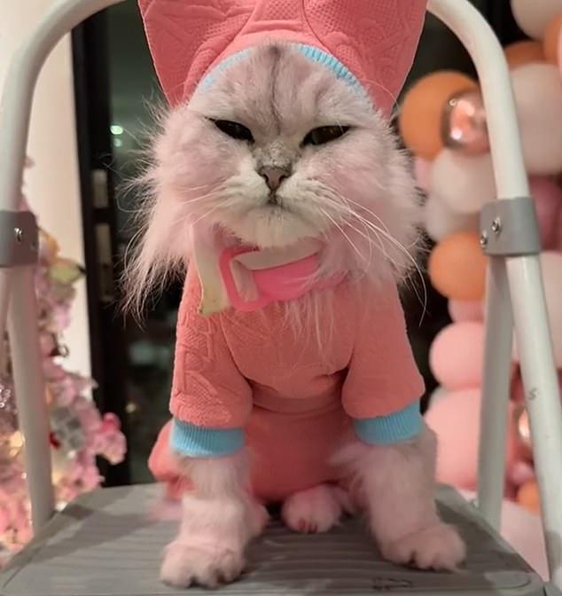 На следующих фотографиях она показала своего питомца с шерстью, окрашенной в пастельно-розовый цвет, одетого в лососевую рубашку с нежно-голубыми деталями.