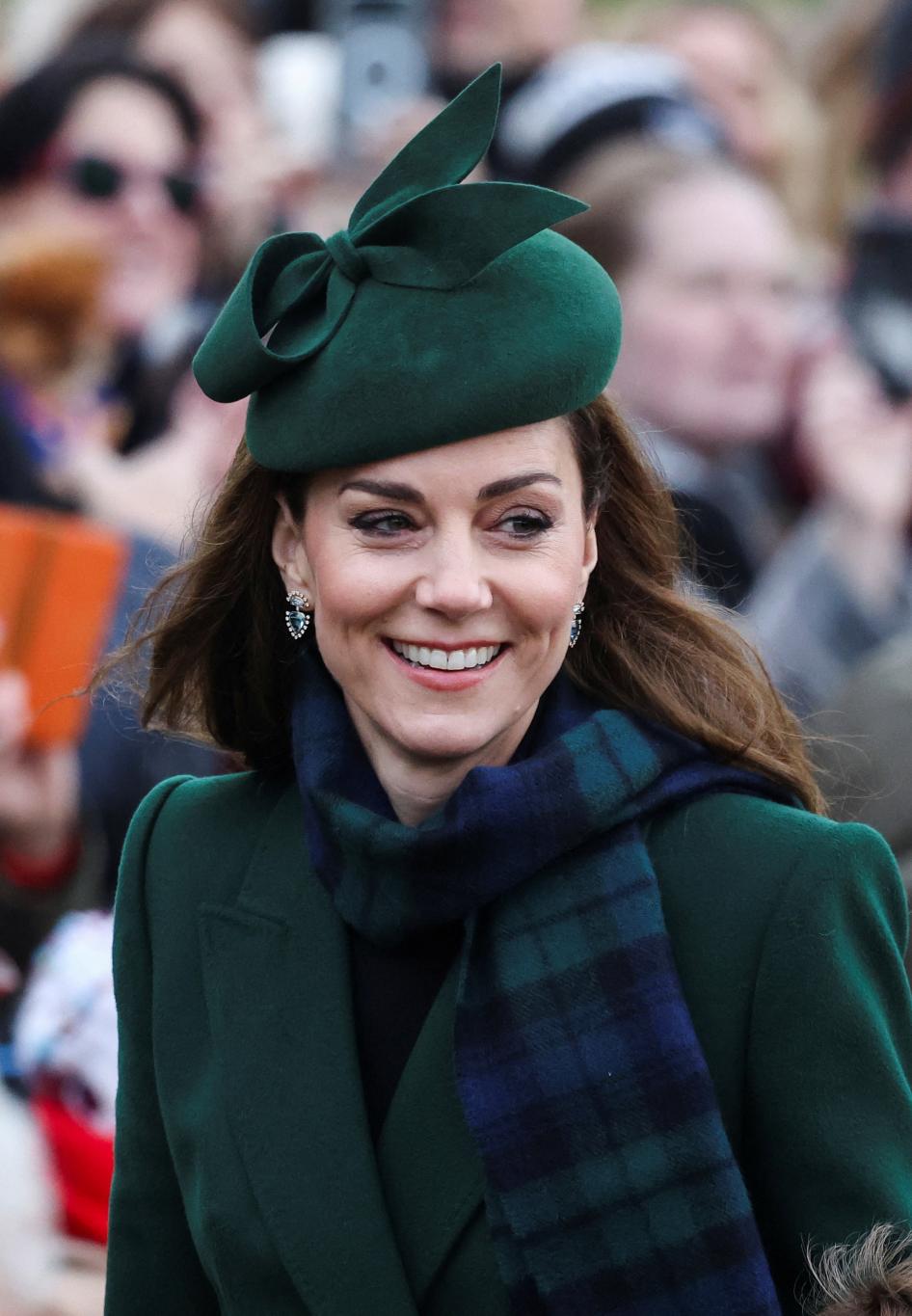 Миддлтон выбрала элегантное зеленое пальто, дополнив его шляпкой-таблеткой в тон и сине-зеленым шарфом в клетку. Завершили праздничный образ черные брюки и черные ботинки.