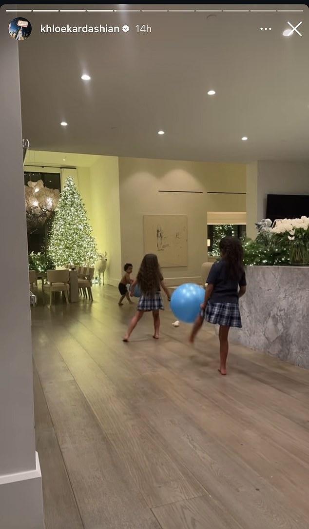 Хлои также поделилась очаровательным моментом со своими детьми Тру, 6 лет, и Татум, 2 года, а также их кузиной Дрим Кардашьян, 8 лет, которые играли под деревом