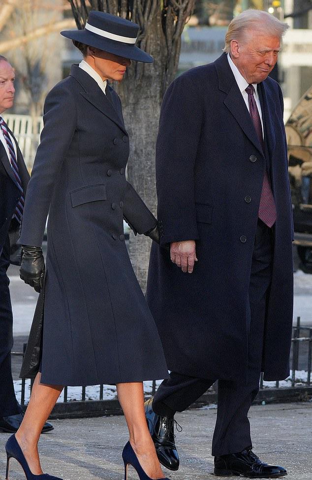 Мелания, 54 года, выбрала для церемонии длинное, приталенное темно-синее пальто от американского дизайнера Адама Липпса, замшевые туфли Manolo Blahnik и черные кожаные перчатки.