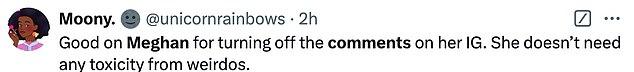 Одни назвали ее «трусихой» за этот поступок, другие же поддержали. «Меган Маркл все та же трусиха. Она отключила комментарии», — язвительно заметила одна женщина. «Нарцисс всегда отключает комментарии. Девушке нужно поддерживать свою популярность», — добавила другая пользовательница. Кто-то ответил на пост с надеждой, что Меган сможет «общаться с поклонниками» в своем аккаунте: «Общаться с поклонниками? Она отключила комментарии», — саркастически написал пользователь, добавив смеющиеся эмодзи.