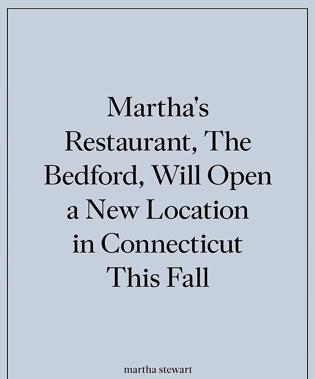 В публикации говорится: «Марта открыла свой первый ресторан The Bedford by Martha Stewart в отеле Paris Las Vegas в 2022 году. Теперь наша основательница открывает второе заведение в Foxwoods Resort Casino в Машантукете, Коннектикут. Открытие нового ресторана запланировано на осень этого года. В меню будет представлен впечатляющий выбор изысканных блюд. Дизайн ресторана призван перенести гостей в загородный дом Марты 1925 года в Бедфорде, штат Нью-Йорк, и познакомить их с тем, чем она славится: элегантностью, теплом и очарованием».