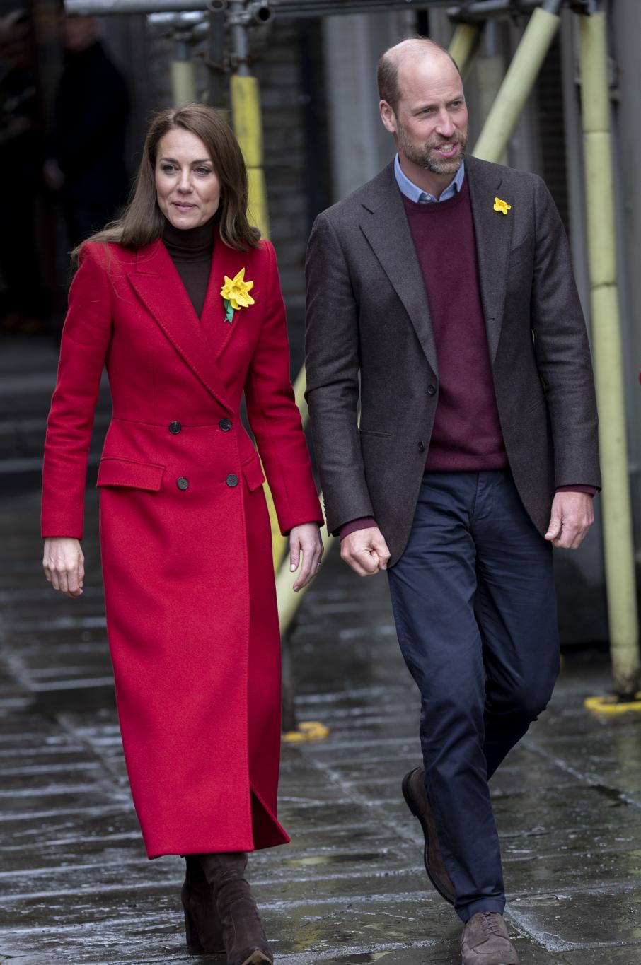 И она, и Уильям дополнили свои образы брошами в виде нарциссов, отдавая дань уважения национальному цветку Уэльса и символу Дня Святого Давида.