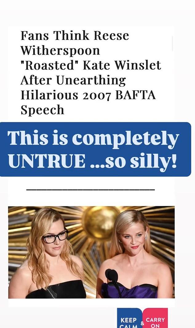 Риз не стала медлить и в субботу опубликовала опровержение: «Привет всем… только что поговорила со своей давней подругой Кейт У. Мы посмеялись над этой глупостью. Пожалуйста, не верьте всему, что пишут в интернете».