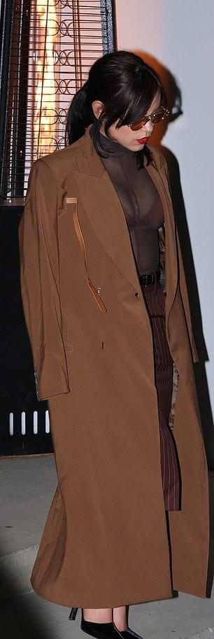 22-летняя звезда сериала «Уэнздей» подчеркнула свою фигуру, выбрав коричневую юбку-миди в тонкую полоску с высоким разрезом.