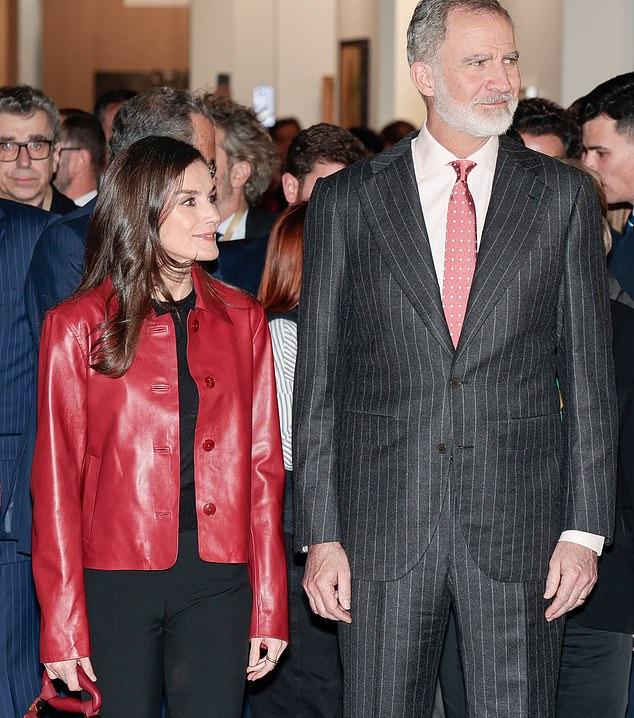 52-летняя королева продемонстрировала смелый образ в кожаной куртке, сопровождая короля Филиппа VI на ярмарке современного искусства ARCO.