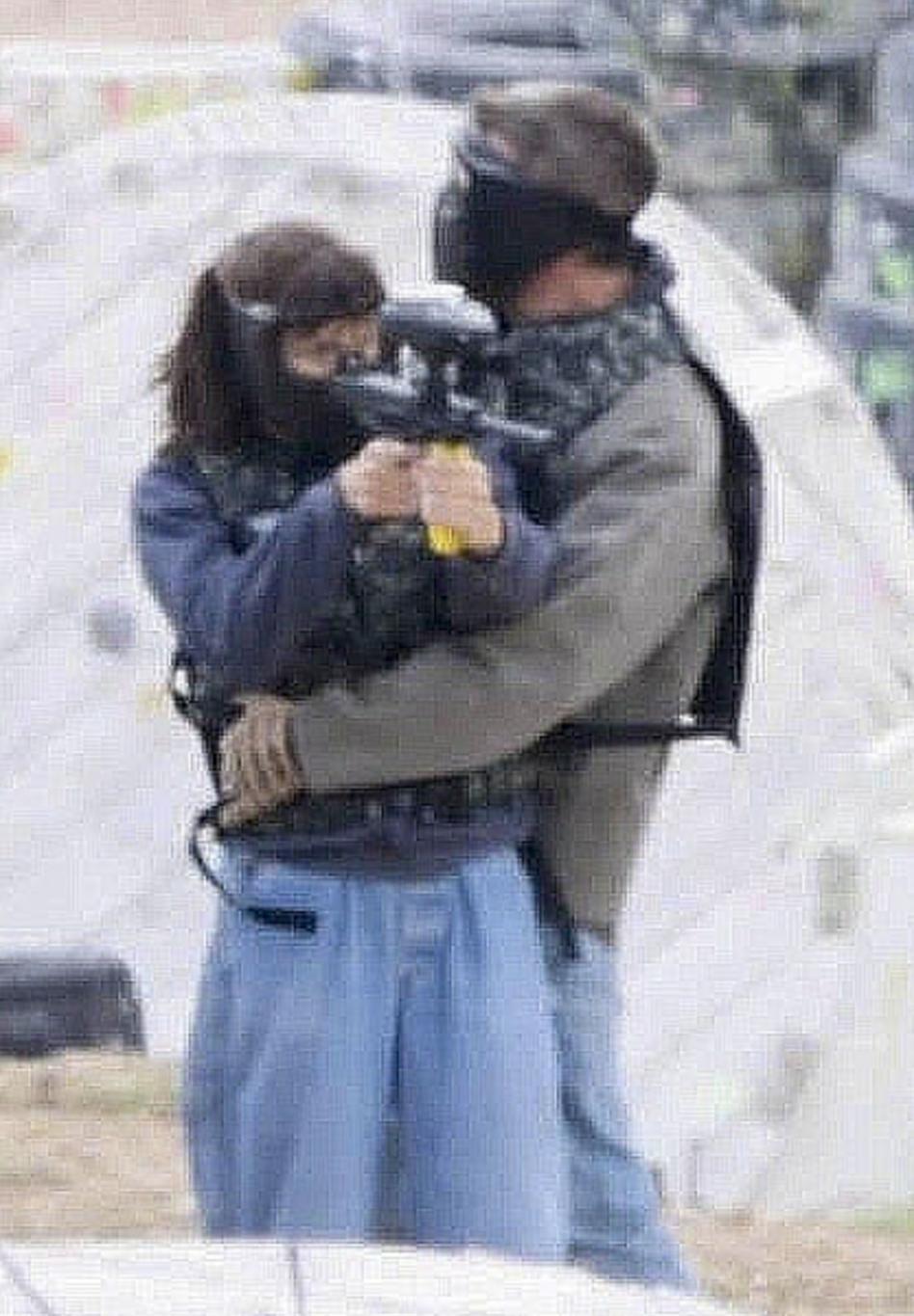 Обладатель премии «Оскар» обнял номинантку на «Эмми» за талию, пока она целилась из пейнтбольного ружья в парке Combat Paintball в Кастайке, штат Калифорния.