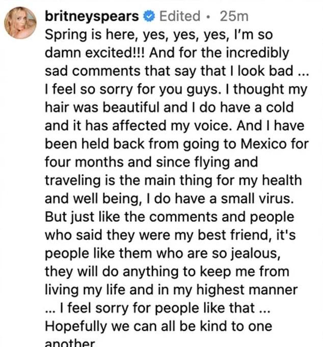 Во вторник 43-летняя Спирс опубликовала сообщение для тех, кто комментирует её внешность. Поп-звезда, которая, по сообщениям, во второй раз рассталась со своим бойфрендом, 37-летним Полом Солизом, написала длинный пост в ответ на троллинг, вызванный её предыдущей, уже удалённой публикацией. Несколькими днями ранее она вызвала беспокойство поклонников видеороликом, в котором показала свои облупившиеся ногти и растрёпанные локоны.