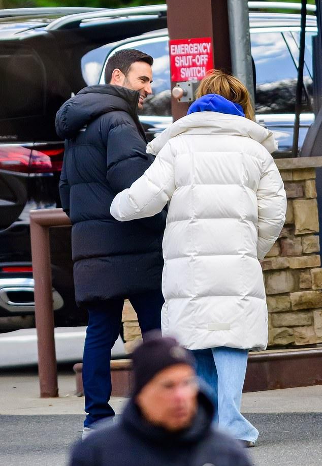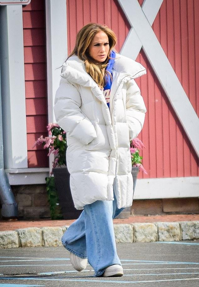 Помимо белого пуховика, на Лопес была синяя толстовка New York Giants, мешковатые джинсы и белые кроссовки на платформе.