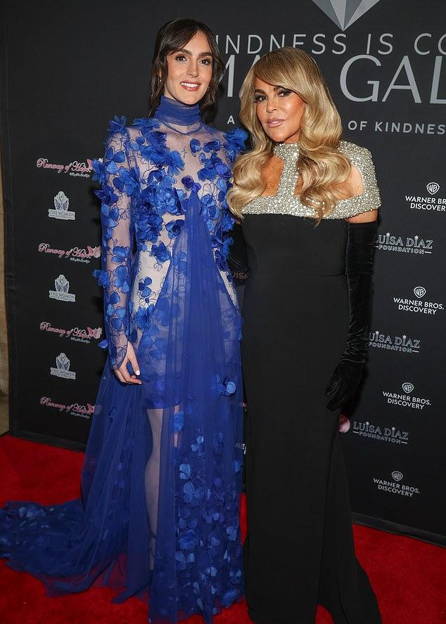 В качестве аксессуаров она выбрала крошечную сумочку, усыпанную стразами, и серебряные украшения, а ее длинные каштановые волосы были уложены в роскошную прическу.