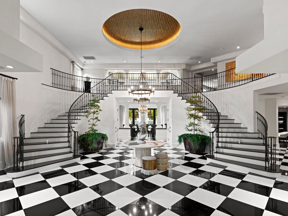 Одной из “фишек” особняка Крис Дженнер является так называемая входная зона, которая впечатляет гостей с первого шага в дом. В случае миллиардерши из клана Кардашьян это огромная люстра, свисающая между двумя лестницами, а также эффектный шахматный пол.