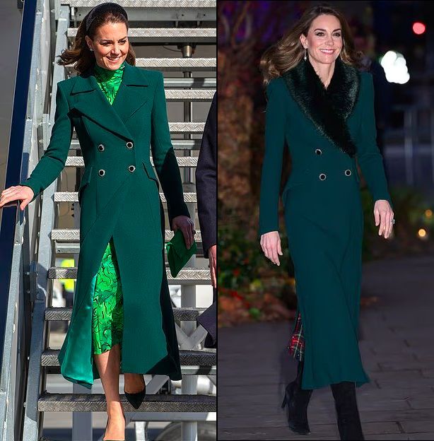 На недавней новогодней службе в Вестминстерском аббатстве Кейт появилась в своем любимом пальто от Catherine Walker цвета лесной зелени. Впервые мы видели его в 2020 году — тогда это был строгий, элегантный образ с острыми лацканами.