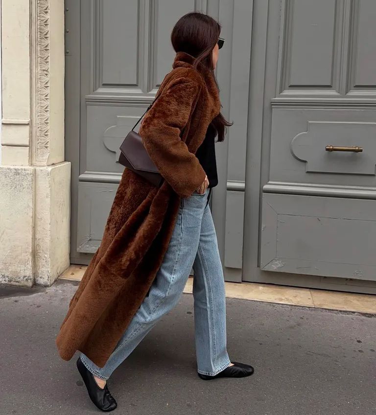 - Классика: Прямая шуба-пальто длиной до середины икры или чуть ниже колена — самый универсальный вариант. Она подходит к любому типу фигуры и сочетается как с платьями, так и с джинсами.
