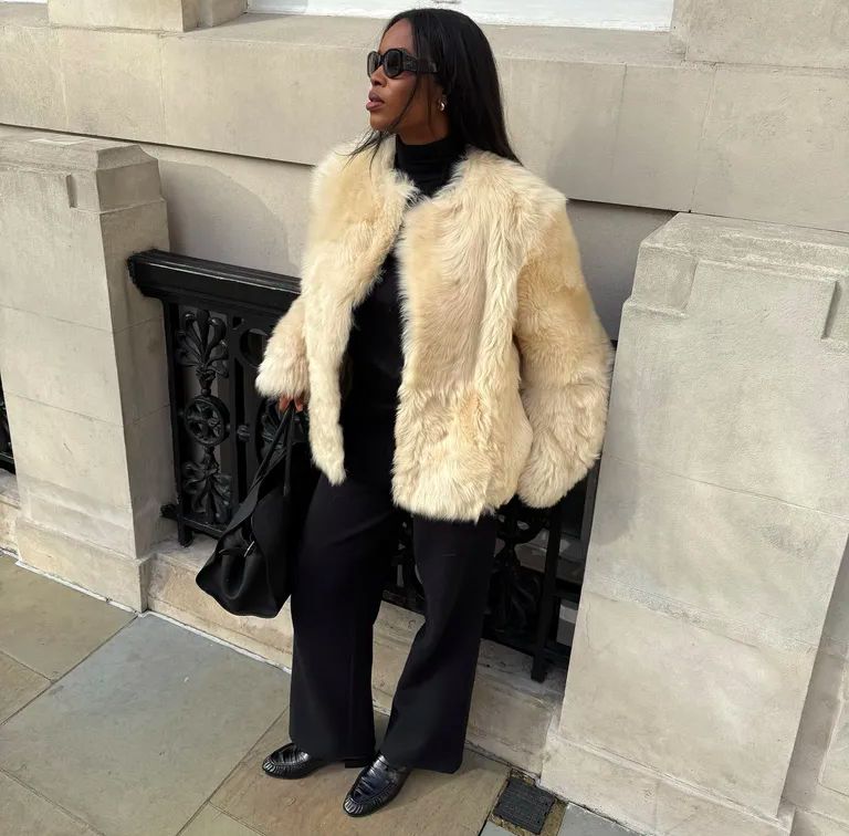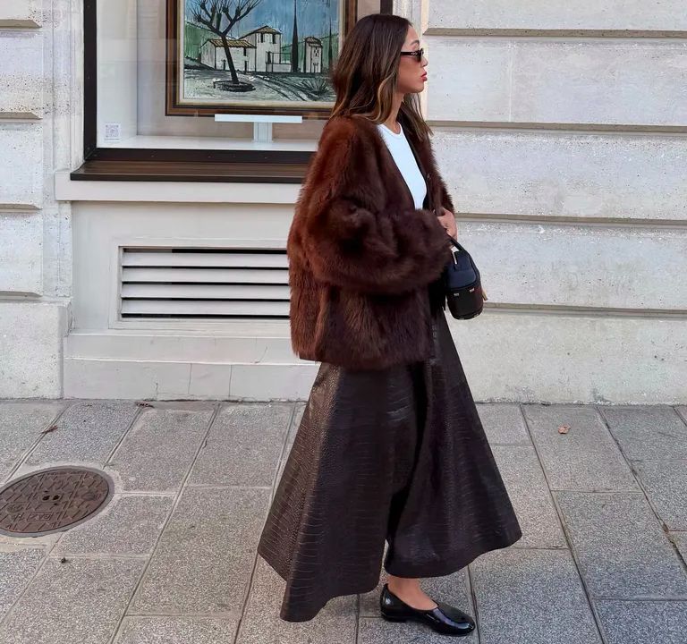 Для более тёплой погоды попробуйте сочетать укороченную шубку с широкими брюками-палаццо и классическими лоферами. Это очень стильный и немного маскулинный образ, который идеально подойдет для офиса или деловой встречи.