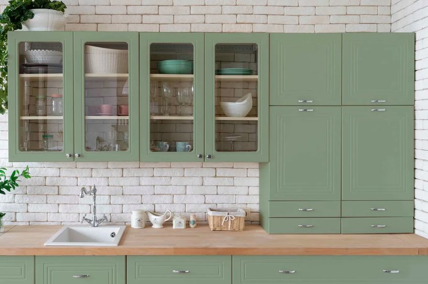 - В тренде: все оттенки зеленого (от шалфея до глубокого оливкового), теплый терракотовый, сложный синий, а также «вкусные» цвета специй: куркума, шафран, корица.