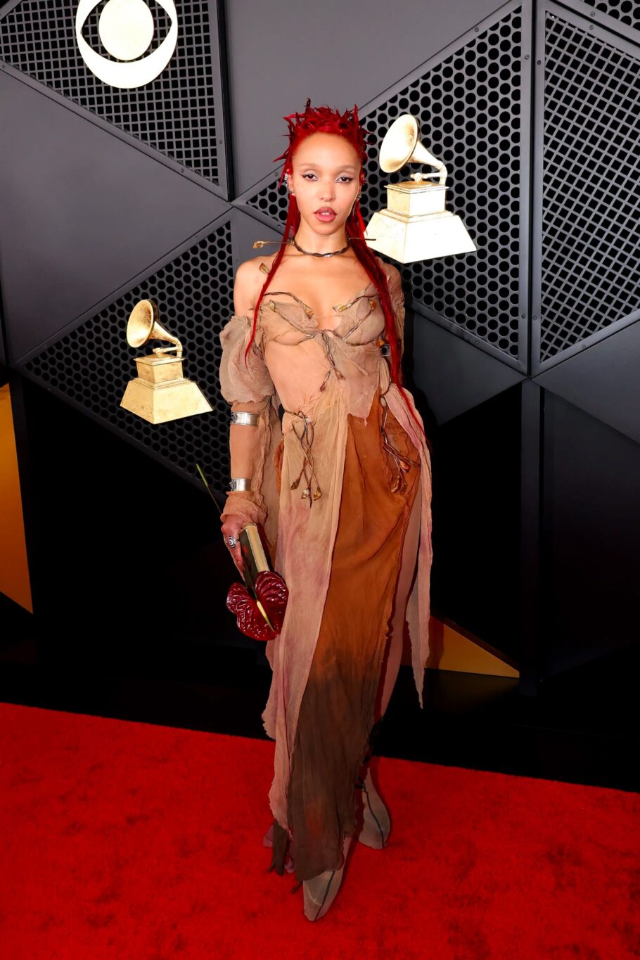Победительница в номинации «Лучший танцевальный/электронный альбом» выглядела так, словно сошла со страниц волшебной сказки. Ее полупрозрачное сетчатое платье было украшено золотыми стеблями цветов, которые обвивали ее фигуру. В руках она держала позолоченную книгу и красный цветок антуриума, который идеально гармонировал с ее яркими волосами.