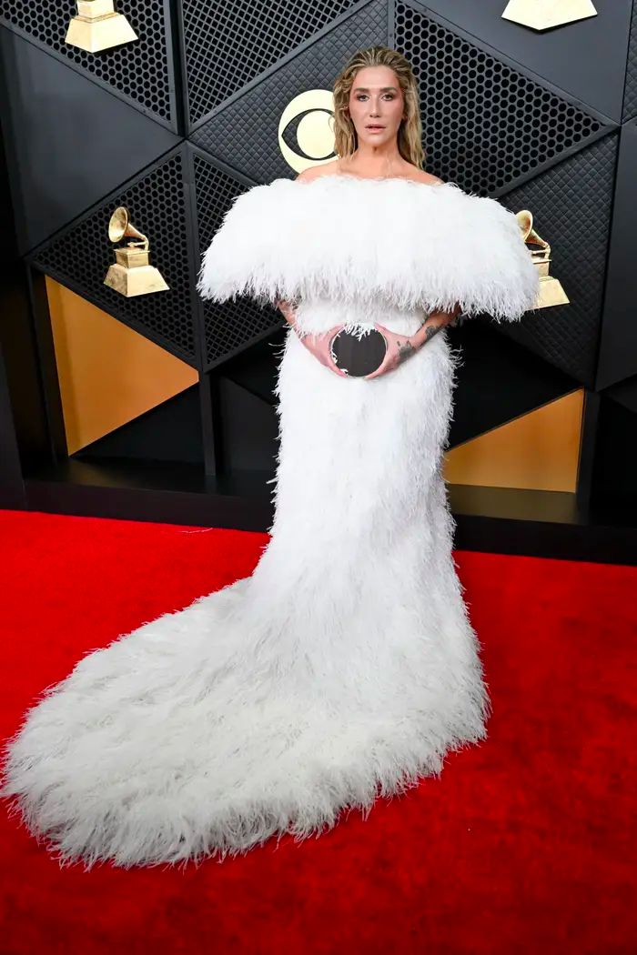 Ещё одна певица выбрала платье из перьев, и мы опять надеемся, что при его создании птицы не пострадали. Для своего первого за 7 лет появления на красной дорожке Кеша выбрала белоснежное платье от Atelier Biser, вызвавшее смешанные отзывы модных обозревателей.