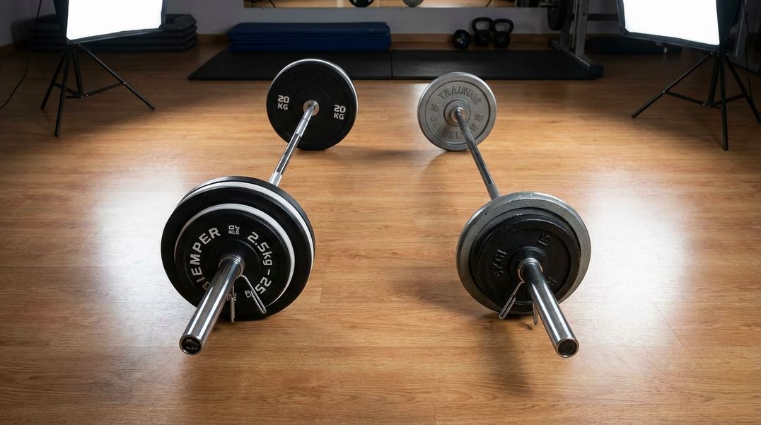 Иллюстрация различий в конструкции олимпийской и тренировочной штанг