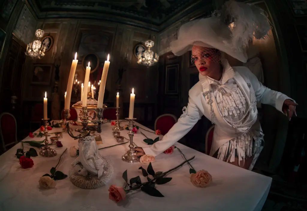 Для масштабной фотосессии, вдохновленной эстетикой высокой моды и сюрреализма, Рианна и её дочь предстали в кастомных образах Dior Haute Couture. 36-летняя певица позировала в элегантном чёрном пальто с контрастной отделкой из белых перьев и эффектной широкополой фиолетовой шляпе. Образ дополнил насыщенный макияж в фиолетово-оранжевых тонах и архивное колье от Cartier.